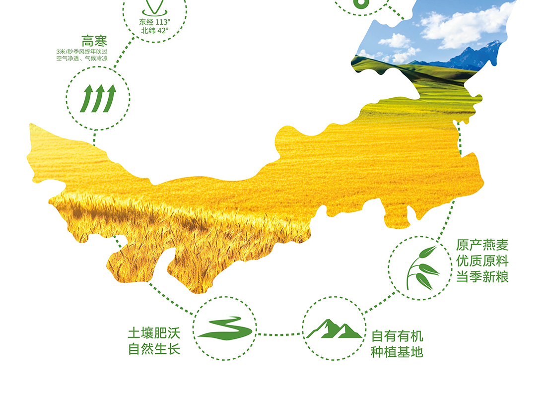 內(nèi)蒙古,世界裸燕麥起源地之一;陰山源生燕麥在此初生滿足生長規(guī)律一切所需,高寒、高海拔、日照充足;遵循自然法則,靠天滋養(yǎng),自然生長;一粒陰山源生裸燕麥,一場(chǎng)無聲有機(jī)革命