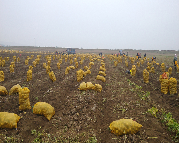當汽車漸近農(nóng)場時,遠遠望去,視野被茫茫一片黃燦燦的景色鎖定?!澳蔷褪秦S收的馬鈴薯嗎?”大家的心情隨之激動起來。車子繼續(xù)前行,一袋袋裝好的馬鈴薯展露在眼前,整齊有序,像昂首等待檢閱的士兵方陣,田間地頭充滿了收獲機的聲音和豐收的喜悅。