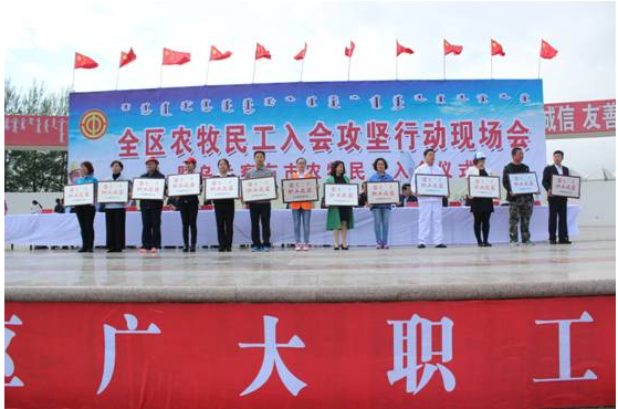 6月14日,全區(qū)農(nóng)牧民工入會(huì)攻堅(jiān)行動(dòng)現(xiàn)場會(huì)暨烏蘭察布市農(nóng)牧民工入會(huì)儀式在我市舉行。我公司組織30人的方隊(duì)參加了入會(huì)儀式。期間,自治區(qū)人大常委會(huì)副主任、總工會(huì)主席杭桂林,自治區(qū)總工會(huì)黨組書記、副主席崔明龍,自治區(qū)總工會(huì)副主席王麗紅,我市領(lǐng)導(dǎo)張琛、李建平、楊國文、王增強(qiáng)、王國相、于生龍,和各盟市工會(huì)分管主席、主管部門部長,各盟市黨委政府所在地的區(qū)(市、旗)總工會(huì)主席,各自治區(qū)產(chǎn)業(yè)工會(huì)負(fù)責(zé)人,自治區(qū)直屬機(jī)關(guān)工會(huì)工委負(fù)責(zé)人,區(qū)總相關(guān)部門負(fù)責(zé)人,市各旗縣市區(qū)工會(huì)負(fù)責(zé)人及部分市直基層工會(huì)負(fù)責(zé)人100余人來我公司進(jìn)行了實(shí)地觀摩考察。